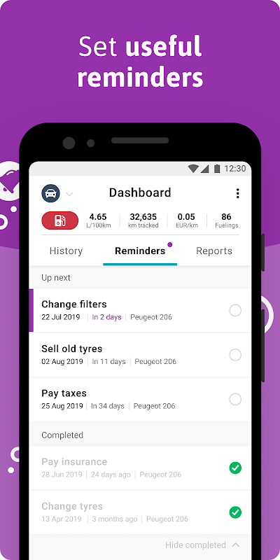 - Pelacakan bahan bakar yang komprehensif (biaya, efisiensi, rata-rata)