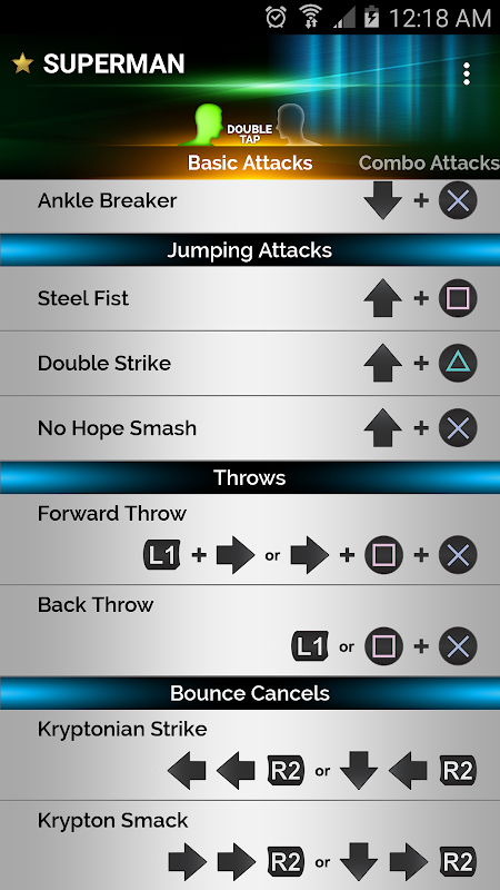 * Moves for all 38 characters! (Aquaman, Atom, Atrocitus, Bane, Batman, Black Adam, Black Canary, Black Manta, Blue Beetle, Brainiac, Captain Cold, Catwoman, Cheetah, Cyborg, Darkseid, Deadshot, Doctor Fate, Enchantress, Firestorm, Gorilla Grodd, Green Arrow, Green Lantern, Harley Quinn, Hellboy, Joker, Poison Ivy, Raiden, Red Hood, Robin, Scarecrow, Starfire, Sub-Zero, Supergirl, Superman, Swamp Thing, The Flash, TMNT, Wonder Woman).