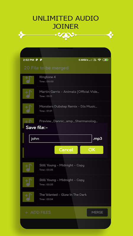 MP3 Merger : Joiner App Create a Mashup with Different MP3 songs or Merger unlimited MP3 songs or Create a Non Stop Music by Merging Different Songs & Music.You can do Anything With This MP3 Merger.