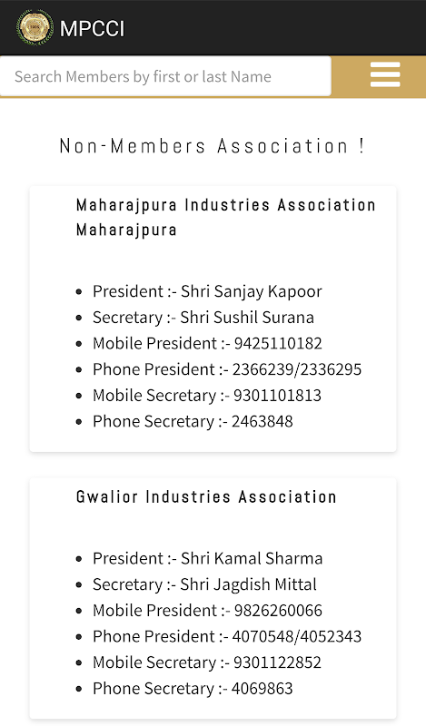 Madhya Pradesh Kamar Dagang & Industri, Gwalior memiliki Office pembawa sebagai Presiden Shri Arvind Agarwal, Presiden Joint Shri Yash Kumar Goyal, Wakil Presiden Shri Suresh Chandra Bansal, Sekretaris Kehormatan Dr Praveen Agarwal, Sekretaris Gabungan Kehormatan Shri Jagdish Mittal dan Bendahara Shri Gokul Chandra Bansal .