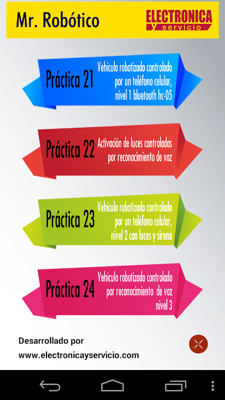 El Mr. Robótico es un proyecto editorial que enseña los principios de la robótica y mecatrónica, a través de fáciles experimentos donde el usuario podrá armar un vehículo robotizado que podrá manipular a través de esta aplicación.