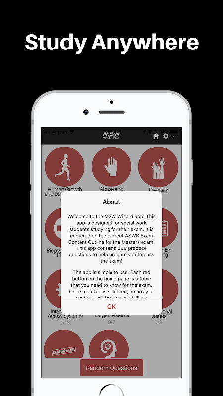 Studying social work? MSW Wizard is the app for every social work student. It is centered on the current ASWB Exam Content Outline for the Masters exam, and any Social Work student will find value in the app. With 800 practice questions, you will be given unlimited access for the simple price to download the app. No subscription, and no hidden fees!