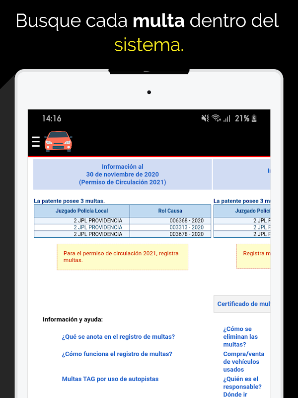 Temukan dengan cepat mengapa Anda didenda, telusuri kata kunci untuk mengetahui apakah Anda melanggar hukum dan lihat semua jenis hukuman yang diterapkan pada semua kendaraan di Republik Chili.