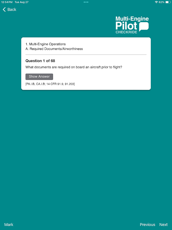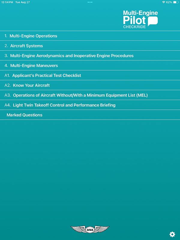 Dengan menggunakan format tanya jawab, Multi-Engine Pilot Checkride mencantumkan pertanyaan yang paling mungkin ditanyakan oleh penguji pada langkah terakhir dalam proses sertifikasi pemeringkatan multi-mesin – Ujian Praktik – dan memberikan tanggapan yang ringkas dan siap pakai. Pilot akan menganggap Aplikasi ini sebagai alat yang sangat diperlukan dalam merencanakan apa yang diharapkan selama checkride pesawat multi-mesin, dan menguasai materi pelajaran. Instruktur menilainya sebagai persiapan yang sangat baik bagi siswa, serta sebagai materi penyegaran umum.