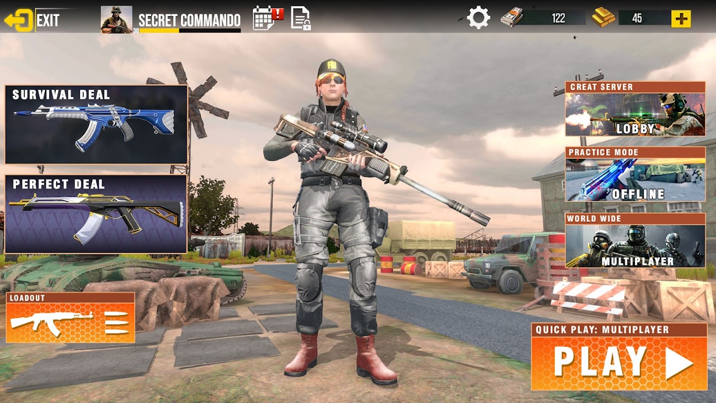 Gameplay dari game survival multiplayer sangat menantang dan mendebarkan. Apakah Anda ingin memainkan game Single player yang paling mungkin, jadi nikmati game senjata offline yang sangat direkomendasikan. Mainkan misi rahasia komando Anda yang sebenarnya & bunuh musuh melalui serangan yang Anda rencanakan. game multipemain offline mencakup berbagai senapan, granat, pistol & senapan serbu Modern Baru dari game 5v5. Anda adalah komando Kapten terlatih, jadi ambil alih dan datanglah di baris pertama untuk memimpin tim Anda & taklukkan pertempuran di game aksi menembak yang mematikan ini.