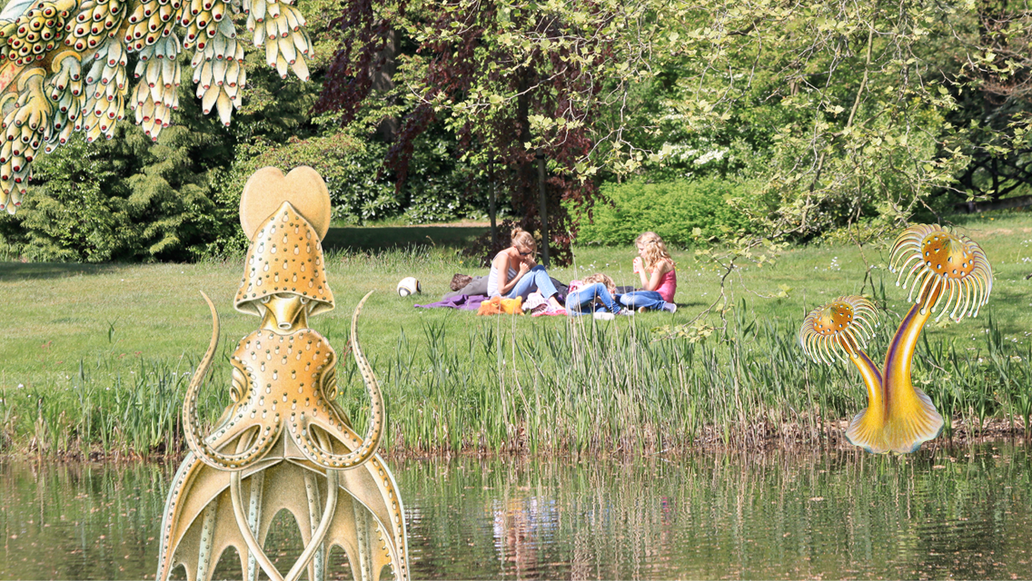 Before taking a picture you can summon your images from the library. Move, scale, copy and mirror them in your viewer. Turning the inside dot around moves your detail behind or in front of the others. Use the eraser and un-eraser for extra effects.