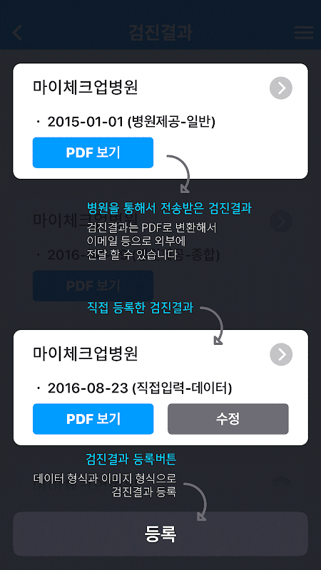 마이체크업과 제휴 중인 병원에서 건강검진을 받으신 후 검진 결과 수령방법을 MyCheckUP으로 신청하시면 병원에서 전송한 검진 결과를 스마트폰으로 내려받아 관리할 수 있습니다.