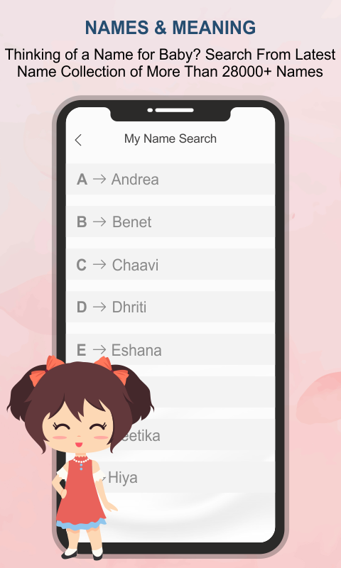 Search and find the most lovable name for your new born child. See the meaning, origin and gender of name. It is a tough job to choose the right name your child. This app makes it easy to look for a name that you just wanted for your child. Here we have collection of 28000+ names that you can choose. Also the name list will be updated regularly for the latest names.