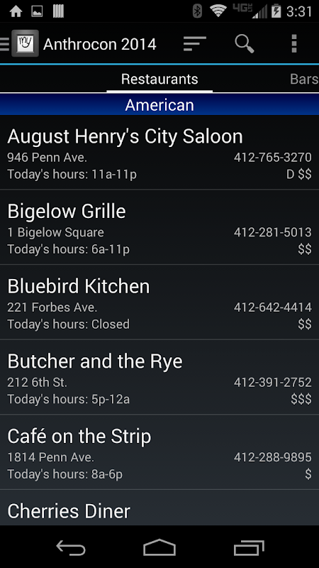 * Restaurant guide, searchable and sortable