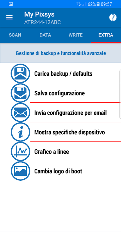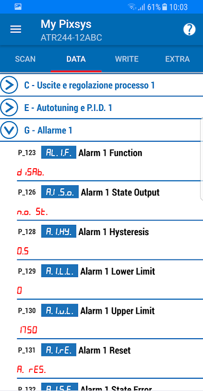 MyPixsys melalui koneksi NFC tanpa kontak akan secara otomatis mengenali perangkat (jika ada di antara yang saat ini disiapkan untuk layanan) dan akan menampilkan, dalam format yang nyaman dengan grup yang dapat diperluas, parameter dan nilai yang mengatur operasinya.