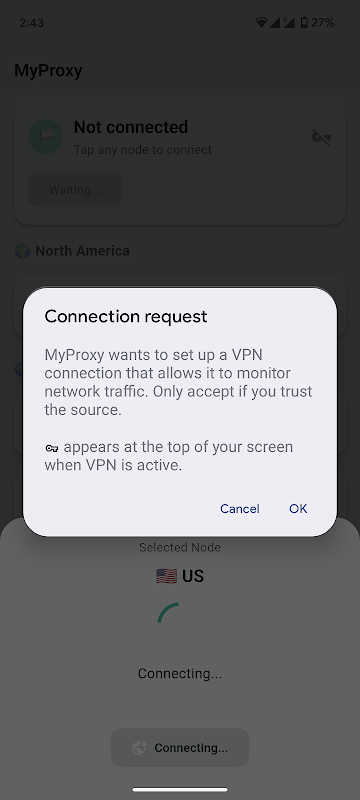 MyProxy adalah aplikasi VPN canggih yang melindungi privasi online Anda dan membantu Anda mengakses internet terbuka dengan aman dan andal. Aplikasi ini menggunakan protokol jaringan aman yang dikembangkan sendiri berdasarkan standar kriptografi modern untuk memastikan koneksi yang privat, terautentikasi, dan tahan sensor — tanpa mengumpulkan atau menyimpan data pribadi apa pun.
