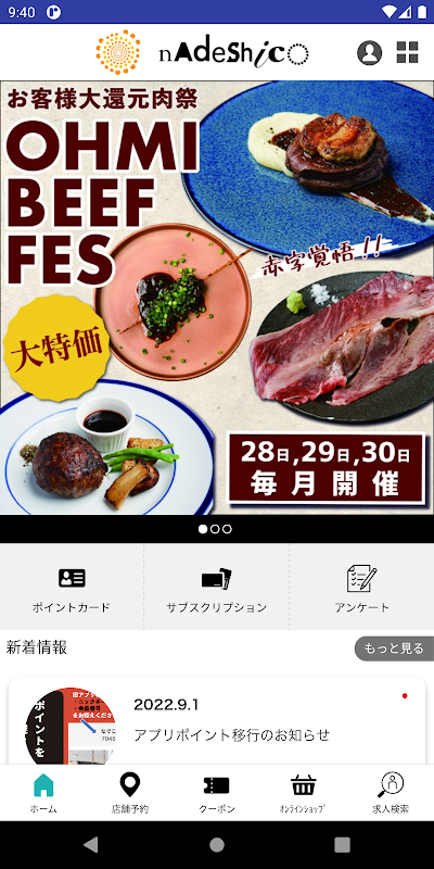 nadeshico group adalah aplikasi yang memungkinkan Anda memperoleh poin di toko nadeshico. Dilengkapi dengan fungsi berlangganan dan toko online. Shiga yang lezat dan menarik melalui makanan