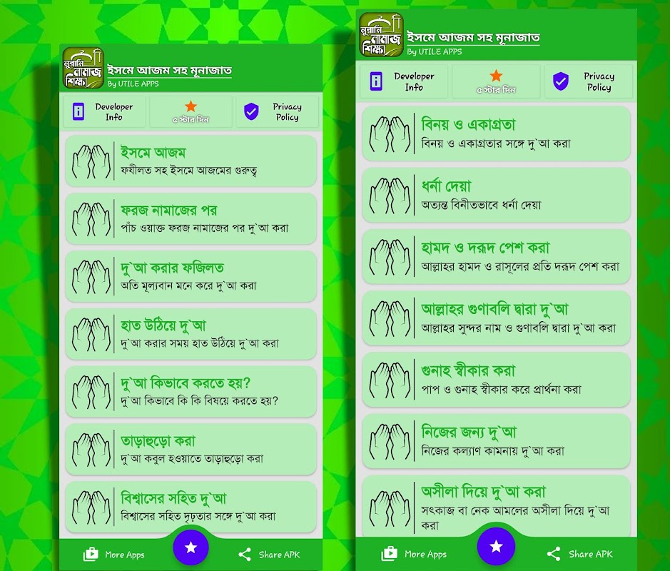 Kami membuat aplikasi namaj sikkha bangla kali ini untuk memberikan namaz shikkha sura o dua untuk semua muslim. Namaz shikkha bangla boi. Mungkin Anda pernah mendengar tentang nurani namaz shikkha boi atau bangla namaj shikkha. Namaz shikkha bangla adalah aplikasi yang paling luar biasa sebagai perangkat lunak namaz shikkha. Jika Anda ingin membeli namaz shikkha boi dari perpustakaan maka Anda harus mengubah keputusan Anda sekarang untuk mengambilnya. Kami mengembangkan aplikasi kami untuk mengantarkan Anda sohih namaj shikkha, namajer niom, namajer sura, namajer niyot, surah kecil untuk namaz atau kecil surah bangla juga.