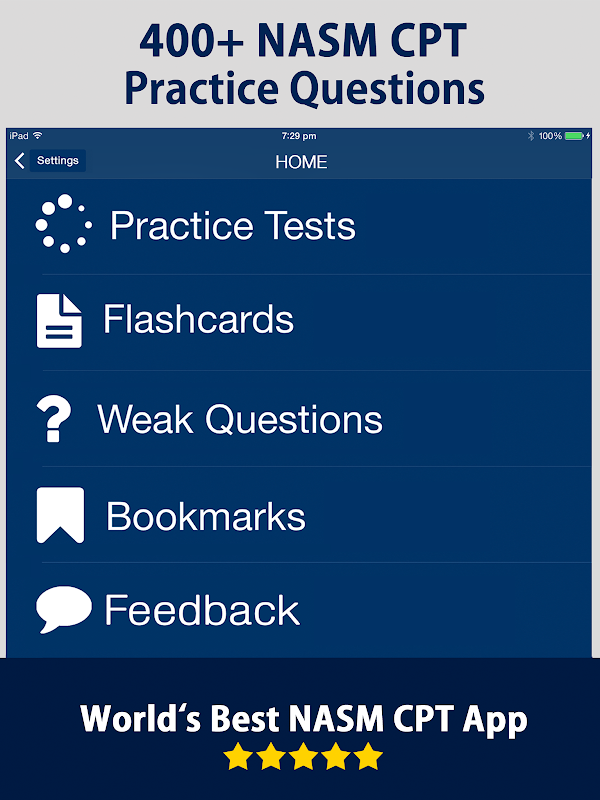 Antarmuka yang ramah pengguna bersama dengan penjelasan terperinci dari pertanyaan ujian Praktik CPT NASM memungkinkan pengguna unggul dalam persiapan Ujian CPT NASM mereka. Melalui penggunaan kartu flash, MCQ, dan tes praktik, persiapan Tes NASM CPT menjadi lebih mudah. Pengguna dapat mempersiapkan dari berbagai set khusus yang berfokus pada konten persiapan Ujian CPT NASM termasuk pengembangan profesional, nutrisi, suplementasi, populasi khusus, modifikasi perilaku, pelatihan terintegrasi, ilmu olahraga dasar, sistem kardiorespirasi, ilmu gerak manusia, penilaian kebugaran, fleksibilitas , pelatihan inti dan banyak lagi. Dengan lebih dari 1500 pertanyaan untuk para pengguna, Ujian Praktek Persiapan Ujian CPT NASM 2020 adalah cara Anda untuk mendapatkan ujian sertifikasi pelatih pribadi Anda.