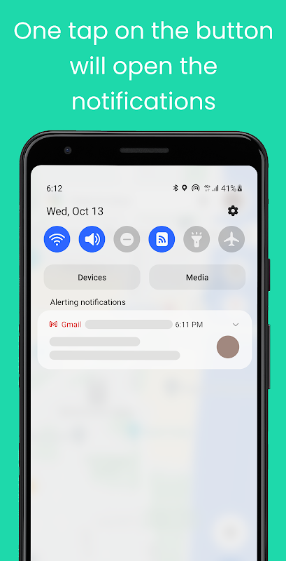 Bosan harus mencapai bagian atas layar setiap kali ada pesan baru yang masuk? Aplikasi ini menambahkan tombol baru ke bilah navigasi ponsel Anda - yang akan menurunkan notifikasi untuk Anda. Cukup ketuk tombolnya, dan notifikasi akan dibuka. Akses mudah dari aplikasi apa pun!