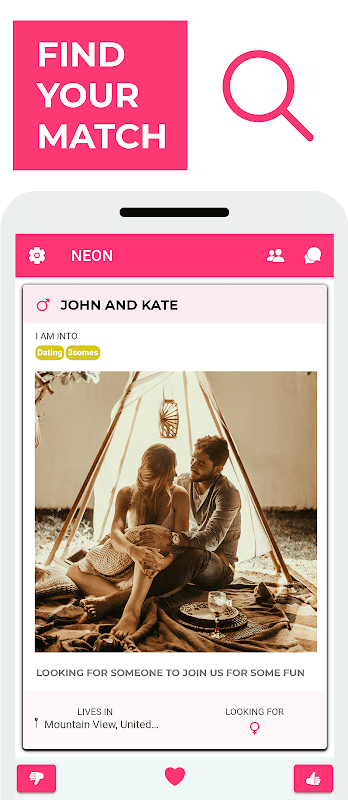 Neon adalah aplikasi kencan untuk single dan pasangan berpikiran terbuka. Baik Anda dalam hubungan berayun, non monogami, atau monogami, Anda dapat menggunakan Neon untuk bertemu orang-orang hebat di dekat Anda.