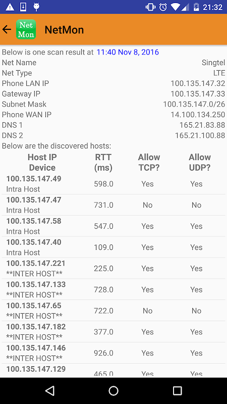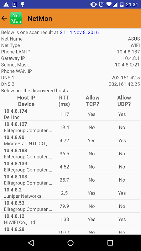 You can also know the detailed information about your network, including gateway IP, subnet mask, WAN IP, DNS servers, and the RTT latency between your device to other hosts.