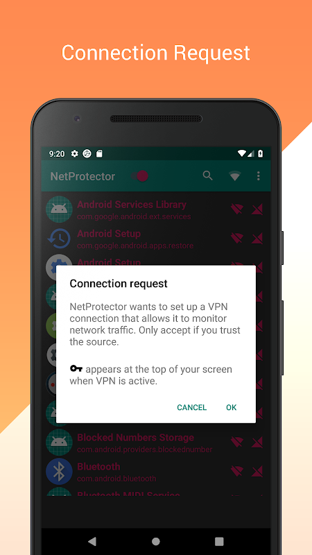 NetProtector ~ Keamanan Jaringan FireWall Aplikasi adalah penjaga jaringan dan alamat secara individual dapat diizinkan atau ditolak aksesnya ke Wi-Fi dan / atau internet data seluler Andakoneksi. NoRoot Android-Firewall membutuhkan NO ROOT .
