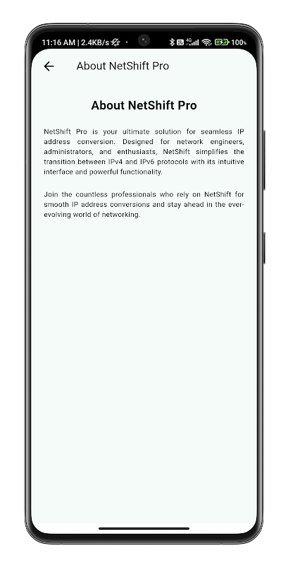 - Sederhanakan transisi antara protokol IPv4 dan IPv6 dengan mudah. NetShift Pro menyediakan antarmuka yang ramah pengguna untuk konversi alamat yang cepat dan akurat, memastikan kompatibilitas di berbagai lingkungan jaringan.