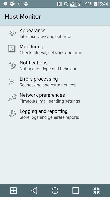 Tuan rumah antarmuka Monitor mendukung pemberitahuan, widget, bergetar, suara dan indikasi LED. Anda dapat menentukan istilah untuk memberitahukan - mis selalu, atau hanya jika kesalahan, atau jika statusnya berubah, dll Juga, Anda dapat mengatur notifikasi melalui email. App dapat menyimpan, acara dan ekspor log dalam berbagai format, dan menyediakan fitur statistik.