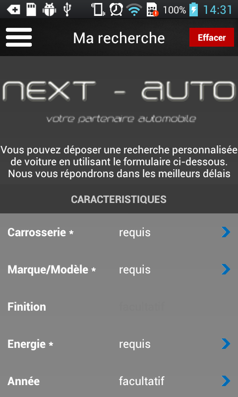 Grace à l’application Next Auto vous pourrez consulter toutes les annonces de véhicules. Vous pourrez sauvegarder vos annonces préférées dans vos Favoris. Grâce à un moteur de recherche intuitif, vous trouverez facilement la voiture que vous cherchez. Vous pouvez aussi déposer une recherche personnalisée depuis cette application pour trouver la voiture de vos rêves sans recherche ni effort grâce au système de recherche personnalisée !