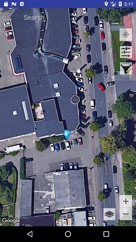 Selain kontrol yang diketahui dari peta, ada tiga tombol lainnya. Mengklik di bagian atas memanggil halaman pengaturan, dengan yang kedua filter dapat dimatikan. Dengan tombol ketiga (di bawah tombol zoom) Anda dapat beralih antara tampilan normal dan satelit.