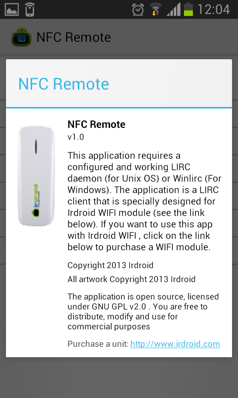 The Irdroid NFC Remote app is a infrared remote control client (LIRC Client) for Android, that will allow you to control your home infrared equipment TV's STB's etc, create infrared macro sequences or group infrared commands, which can be written to any standard NFC Tag. Then you can start your predefined infrared macro by simply tapping the NFC Tag to your device.The application is perfect for automating infrared remote control tasks such as turning on the lights via infrared, executing a sequence of IR commands in a click of a button, or by tapping your NFC Tag to your device. With this app you can automate your TV, STB, DVB Audio and many other infrared controlled equipment. The application requires a fully setup and operational LIRC daemon (for Linux) or Winlirc (for Windows). The application is specially designed to work with the Irdroid WIFI infrared remote control modules. If you want to access the full benefits that the app provides, you may consider purchasing a Irdroid WIFI module from http://www.irdroid.com