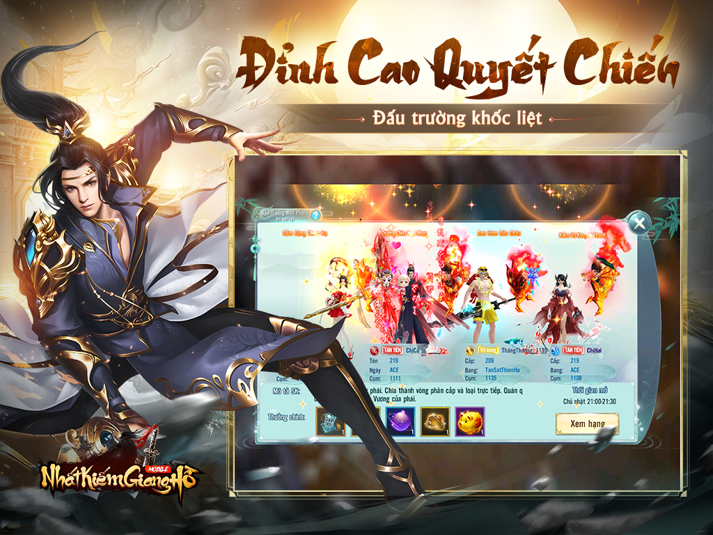 Nhat Kiem Giang Ho - Game Vo Lam Chinh Tong. Nhat Kiem Giang Ho adalah gim peran seluler daring dengan kisah seni bela diri. Pemain dapat berpartisipasi dalam pertempuran berdarah Song Kim, memburu bos Hoang Kim, dan Cong Thanh Chien bersama saudara-saudara di guild - kenangan yang terkait dengan masa kecil berbagai generasi.