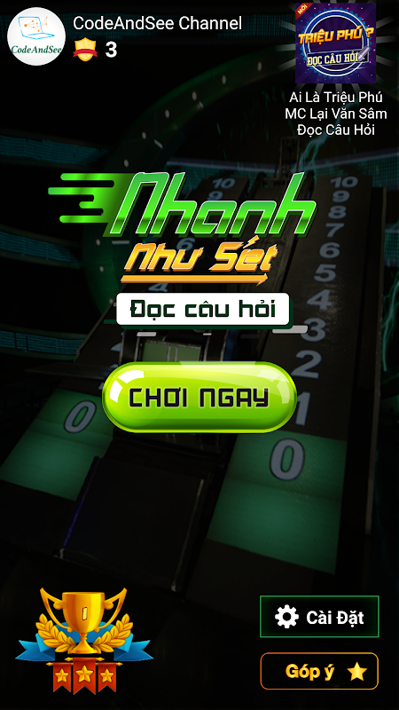 ⚡ Secepat Petir - Baca Pertanyaan ⚡atau b> Secepat Petir - Baca Pertanyaan ⚡ adalah permainan kuis yang menyenangkan, kuis trivia, kuis pengetahuan berdasarkan Quick gameshow Seperti Chop on HTV7, game memiliki audio yang di-host oleh MC Truong Giang, Hari Won, membaca pertanyaan dan 4 jawaban yang menjanjikan pengalaman bagi para pemain sebagai peserta utama. Gameshow terakhir.
