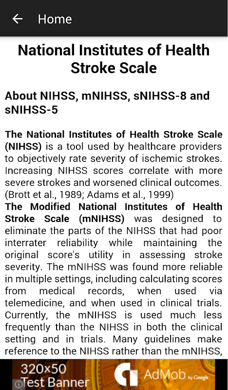 Aplikasi ini menghitung skor NIHSS, skor NIHSS yang dimodifikasi, skor NIHSS 8 item pendek, dan skor NIHSS 5 item pendek. Ini dimaksudkan untuk digunakan oleh para profesional kesehatan.