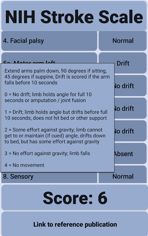 Ini adalah implementasi dari skala goresan NIH sebagaimana didefinisikan dalam - https://www.stroke.nih.gov/documents/NIH_Stroke_Scale.pdf - Pencipta aplikasi ini tidak terkait dengan NIH oleh karena itu tautan ke manuskrip asli adalah disertakan melalui tombol di antarmuka pengguna. Aplikasi ini dibuat untuk menyediakan pengingat dan kalkulator yang mudah diakses untuk evaluasi sisi tempat tidur pasien.