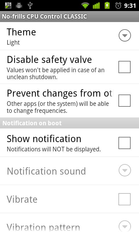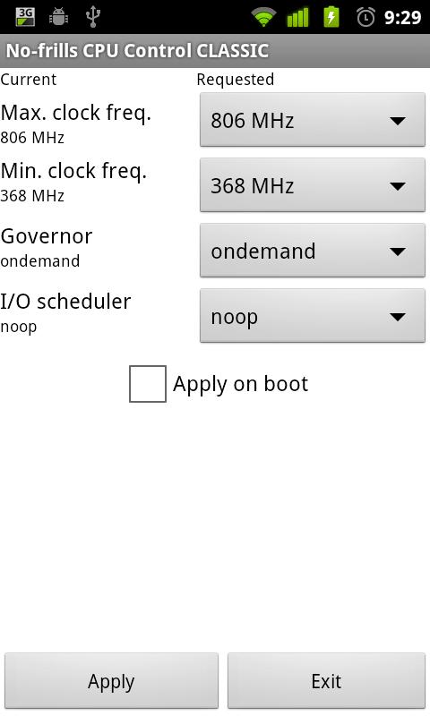 No-frills CPU Control CLASSIC is a trimmed down version of the popular No-frills CPU Control. It is meant for older devices running Android 1.6 "Donut" or Android 2.0 "Eclair" or for people who want an app as small as possible: just around 400KB!