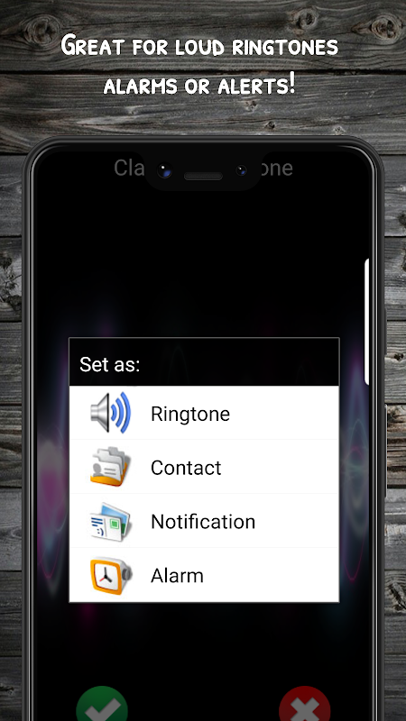 pertama-tama cukup pratinjau nada dering atau suara yang keras dan jelas. jika Anda suka, tekan centang hijau dan pilih nada dering, alarm, notifikasi, atau kontak.