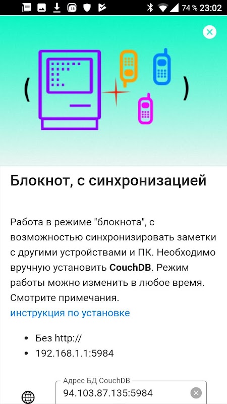 2) Mode dengan sinkronisasi. Dalam mode ini, notebook Anda dapat menyinkronkan data dengan PC. Untuk melakukan ini, Anda harus menginstal database - CouchD. Ada juga aplikasi analog untuk Windows.
