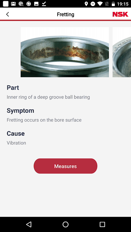 Aplikasi ini juga mencakup banyak gambar dan klip suara untuk membantu pengguna mendiagnosis jenis kerusakan bantalan dan kemungkinan penyebabnya. Penjelasan terperinci membantu pengguna mempelajari karakteristik utama dari berbagai jenis kerusakan bantalan.