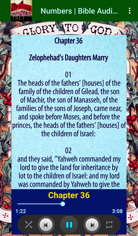 Sebuah aplikasi untuk siapa saja yang ingin tahu tentang agama Kristen langsung dari sumbernya (Alkitab). Nikmati bab Lengkap Bilangan (Kitab Angka) dalam audio berkualitas baik dengan transkrip (teks). Nikmati indahnya firman Tuhan kapanpun dan dimanapun - bahkan tanpa koneksi internet (offline) - melalui gadget Android Anda. Aplikasi ini menyajikan kepada Anda bab Bilangan lengkap berdasarkan World English Bible (WEB). Anda dapat menikmati semuanya dengan cepat, sederhana, dan mudah. Suatu keharusan bagi jiwa Kristen yang berbakti.
