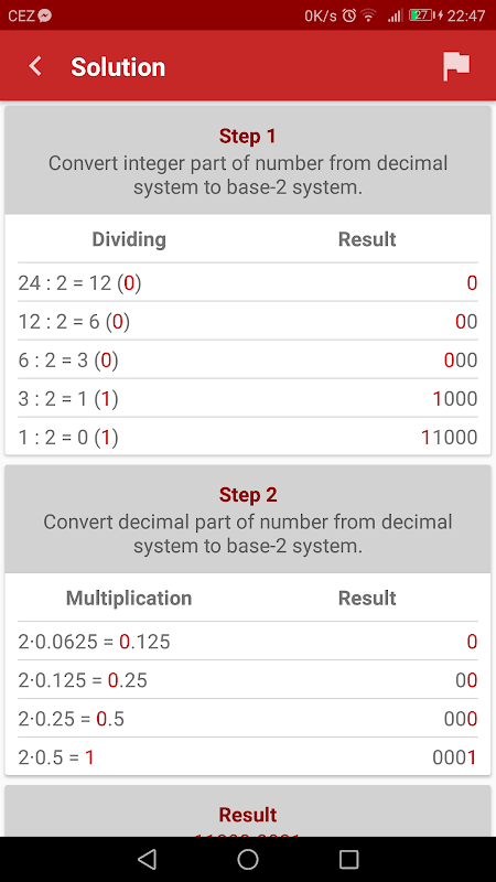 Numeral Converter + Calculator is a simple and smart application for calculating and converting numbers between numeric systems. The application can count any arbitrary long, decimal or negative numbers and convert them between systems. App is able to show the solution algorithm. It supports system with bases from 2 to 36.
