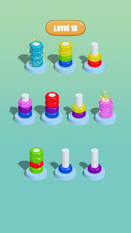 Jika semua mur dipasang pada baut berdasarkan warna, permainan selesai.
