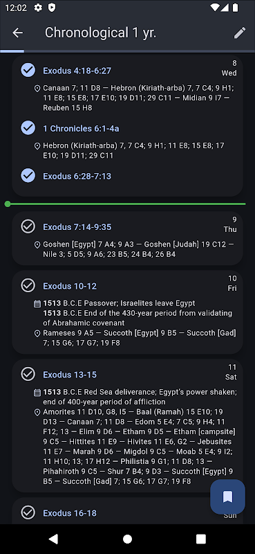 • Melacak kemajuan membaca Anda dan menunjukkan jumlah hari Anda lebih cepat atau lebih lambat dari jadwal.