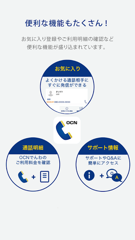 Aplikasi "Telepon OCN" adalah aplikasi yang memungkinkan Anda dengan mudah menggunakan panggilan "Telepon OCN" yang kompatibel dengan suara OCN Mobile ONE.