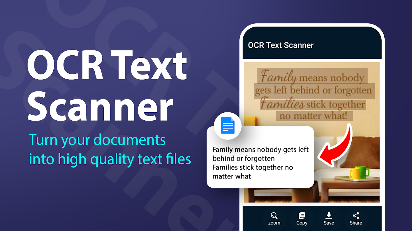 Aplikasi pemindai teks OCR (Optical Character Recognition) adalah aplikasi perangkat lunak yang memungkinkan pengguna mengubah teks cetakan atau tulisan tangan menjadi teks digital yang dapat diedit. Aplikasi ini menggunakan teknik pemrosesan gambar untuk mengenali karakter dalam gambar dan mengubahnya menjadi teks yang dapat dibaca mesin. Proses menggunakan aplikasi pemindai teks OCR biasanya melibatkan pengambilan foto dokumen atau teks menggunakan kamera perangkat seluler atau pemindai. Aplikasi pemindai OCR kemudian menganalisis gambar dan mengidentifikasi karakter yang ada di dalamnya, sebelum mengubahnya menjadi teks yang dapat diedit, disimpan, atau dibagikan. Aplikasi pemindai teks OCR memiliki banyak manfaat, seperti meningkatkan produktivitas dan efisiensi dengan mengurangi waktu dan upaya yang diperlukan untuk menyalin teks secara manual. Ini dapat sangat berguna untuk bisnis yang perlu mendigitalkan dokumen kertas dalam jumlah besar, serta untuk individu yang ingin mengubah catatan atau materi tertulis lainnya menjadi format digital dengan cepat dan mudah. Secara keseluruhan, Gambar terselubung ke teks - aplikasi pemindai teks OCR adalah alat serbaguna dan berguna yang dapat digunakan oleh berbagai individu dan organisasi untuk meningkatkan efisiensi dan aksesibilitas. Pemindai Teks OCR adalah aplikasi inovatif dan efisien yang menggunakan teknologi Pengenalan Karakter Optik (OCR) canggih untuk memindai dan mengekstrak teks dengan cepat dan akurat dari dokumen atau gambar apa pun. Dengan fitur canggih dan antarmuka yang ramah pengguna, aplikasi pemindai OCR ini memungkinkan Anda mendigitalkan dan mengatur dokumen, kwitansi, kartu nama, dan lainnya dengan mudah.