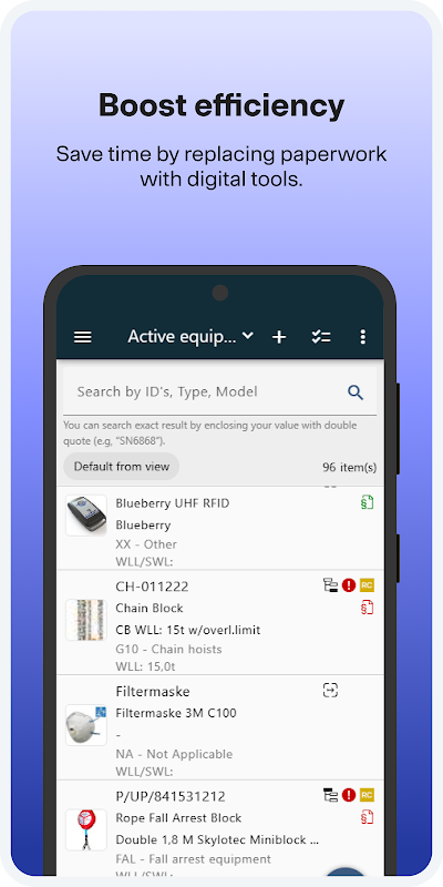 • Tandai peralatan dengan tag NFC dan kode QR untuk mengidentifikasi dengan cepat apakah peralatan tersebut aman digunakan