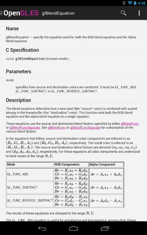 This app provides the best reading experience for the OpenGL ES reference pages on your phone or tablet.