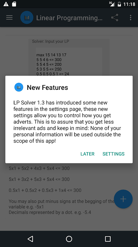 The application works as follows, each LP equations is represented by either 2 key words "min" & "max" (min for minimization and max for maximization). Followed by the objective function variables with each of the variables separated by 1 space, at the end of each equation no need to add any spaces just a return is enough: