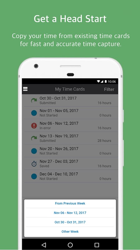 Dengan Oracle PPM Cloud Mobile, anggota tim dapat dengan mudah menangkap waktu aktual mereka dalam mengerjakan proyek dan tugas keuangan. Saat membuka kartu waktu seluler, tidak perlu mencari tugas yang sedang Anda kerjakan, mereka akan ditampilkan secara otomatis. Anda cukup memasukkan waktu Anda dan menyerahkan untuk persetujuan dan pemrosesan. Anda dapat menyalin kartu waktu sebelumnya atau favorit ke kartu waktu Anda saat ini untuk pengambilan dan pemrosesan waktu yang cepat dan mudah.
