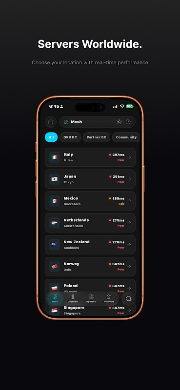 Terhubung ke lebih dari 60 lokasi server di seluruh dunia hanya dengan satu ketukan menggunakan Smart Connect, yang secara otomatis memilih protokol tercepat dan paling andal untuk jaringan Anda. Pilih dari protokol WireGuard, VLESS, dan OrbConnect untuk kecepatan dan keamanan optimal. Mode Bridge menambahkan lapisan privasi ekstra melalui perutean multi-hop.