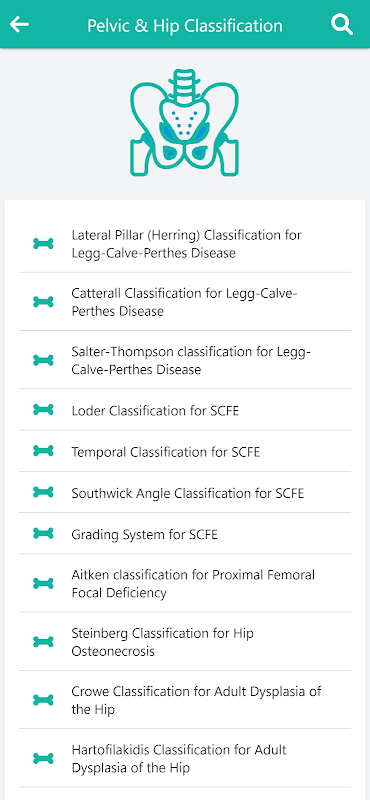 Aplikasi klasifikasi ortopedi berisi semua sistem klasifikasi patah tulang seperti klasifikasi patah tulang kepala humerus (klasifikasi Neer) dan klasifikasi penyakit ortopedi seperti klasifikasi osteonekrosis kepala femoral (klasifikasi Vicat).