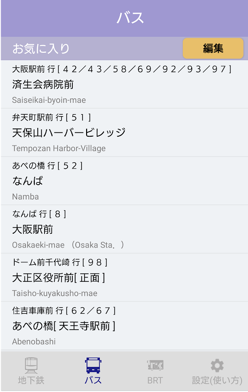 Dengan mendaftarkan halte, rute, dan tujuan yang sering digunakan di "favorit", Anda dapat melihat informasi pendekatan bus hanya dengan dua ketukan dari layar atas.