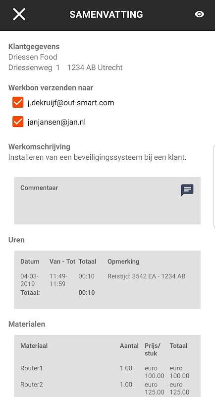 OutSmart adalah solusi generik digital untuk penggantian perintah kerja kertas, bagi pengusaha yang ingin membuat perbedaan dalam mengatur layanan lapangan dengan lebih efisien. Anda mendaftarkan jam kerja dan item Anda pada perintah kerja. Anda dapat menambahkan foto karya Anda (misalnya sebelum dan sesudah) dan pelanggan Anda akan menambahkan tanda tangan digital ke dalamnya. Langsung di smartphone atau tablet. Kami kemudian akan memastikan bahwa voucher dikirim ke pelanggan Anda sebagai PDF di email. Sederhana dan efektif.