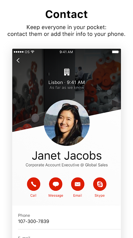 Aplikasi ini memungkinkan karyawan untuk cepat mencari dan menjangkau rekan apapun.
